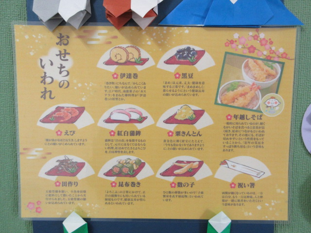 おせちのいわれ 2026年1月23日 最終更新日時 : 2026年1月23日 kumagaya_edit 食育コーナーにおせち料理のそれぞれにどんな意味があるのかが掲示されていました。エビ:腰が曲がるほど長生き、栗きんとん:黄金色の財宝、昆布巻き:よろこぶ・・・勉強になります。