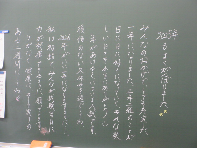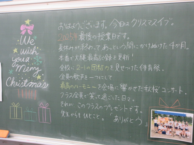よい冬休みを! 2025年12月24日 最終更新日時 : 2025年12月24日 kumagaya_edit 冬休みの生活の確認、机・ロッカーの整頓などを行い、2025年の授業は終了しました。休み中にはいろいろな人と会ったり、お出かけをしたりする機会があると思います。この1年の成長した姿を見せられるとよいですね。