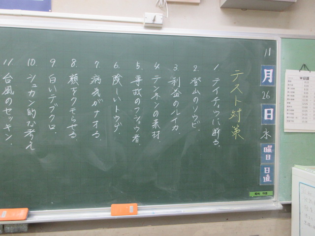 テスト対策として黒板に漢字の問題が出題されています。
