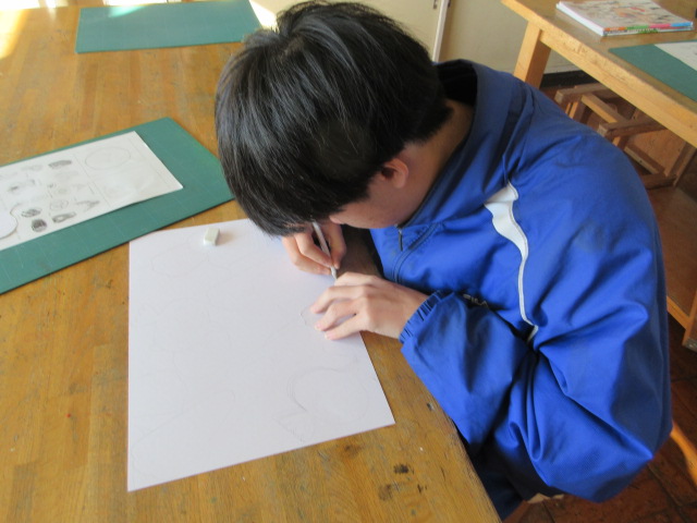デザイン(2年) 2026年2月12日 最終更新日時 : 2026年2月12日 kumagaya_edit 果物をモデルに型を作りました。先生のアドバイスを受けながら、型を何度も使って1枚の紙を埋め尽くしています。並べ方に個性を感じます。