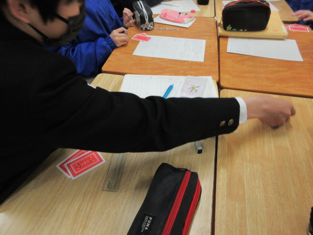 トランプゲーム(1年) 2026年3月23日 最終更新日時 : 2026年3月23日 kumagaya_edit トランプを使って数字合わせのゲームを行っています。黒は正の数、赤は負の数。楽しそうです。