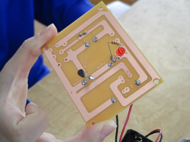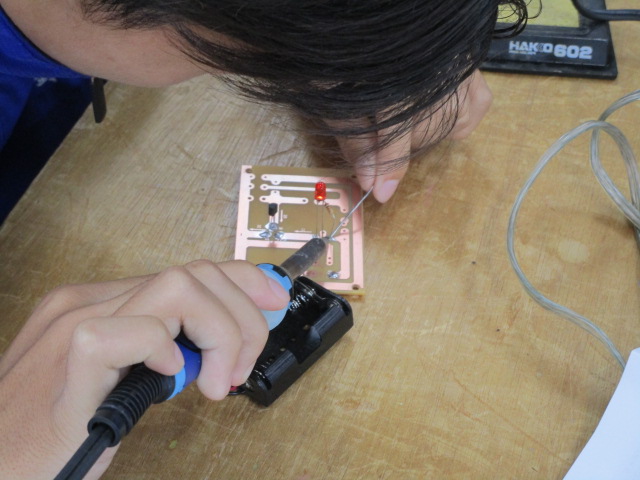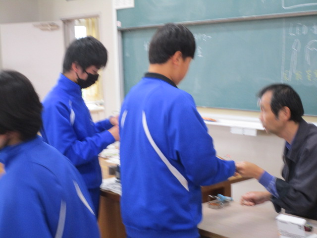 ハンダ付け(2年) 2025年10月31日 最終更新日時 : 2025年10月31日 kumagaya_edit 授業の様子を見学していると、「めっちゃきれいにできた!」と見せてくれた生徒もいます。部分ごとにできあがったら、先生に確認してもらいながら作業を進めて、少しずつ完成に近づいています。