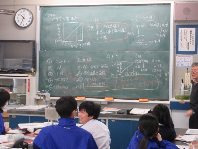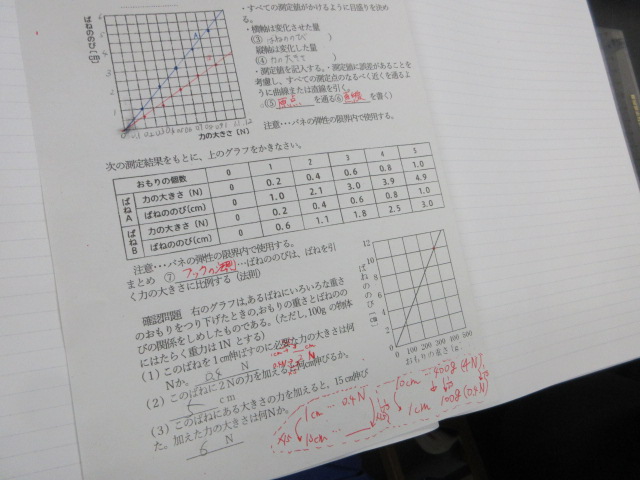 おもりでの実験結果をもとに、練習問題を通してフックの法則を確認しています。