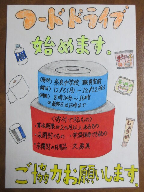 【予告】フードドライブ始めます 2025年12月1日 最終更新日時 : 2025年12月1日 kumagaya_edit 今年もフードドライブを行います。8日(月)~です。各ご家庭のご協力をよろしくお願いします。※ポスターは永崎生徒会長が作成してくれました。
