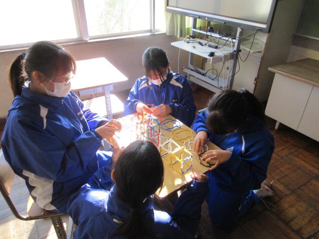 ポリドロン(1年) 2025年12月17日 最終更新日時 : 2025年12月17日 kumagaya_edit 昼休みの一室。ポリドロンで立体を作っている生徒がいました。三角形や四角形を組み合わせて立体をつくるパズルです。