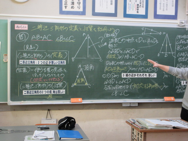 二等辺三角形の定義(2年) 2025年12月1日 最終更新日時 : 2025年12月1日 kumagaya_edit 2辺が等しい三角形を二等辺三角形という。当たり前のことを何をいまさらと思うかもしれませんが、これを定義とし、様々な性質を証明していきます。
