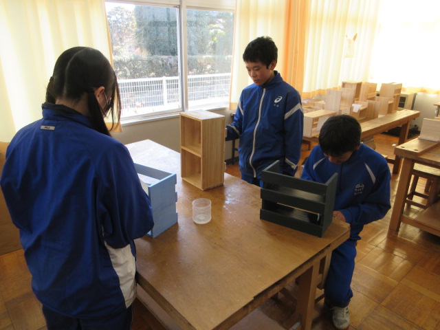 半分の生徒が本棚に色を塗っています。終わってしまった生徒は教室で自習中です。