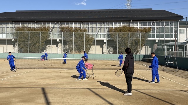 強風の中、テニス部が練習をしています。風の影響が少ないメニューです。