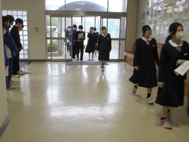 生徒会による挨拶運動、体育委員のハンドサインによる無言集合が行われています。