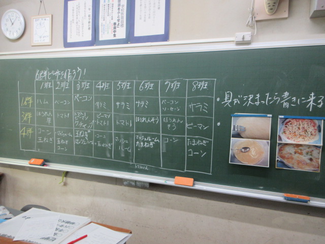 具材決定(1年) 2026年3月4日 最終更新日時 : 2026年3月4日 kumagaya_edit 来週、調理実習でピザを作ります。食品群の中からバランスよく具を選びました。チーズが入っていないなあと思ったら、それはマストとのことです。