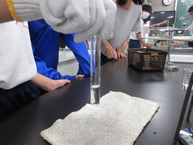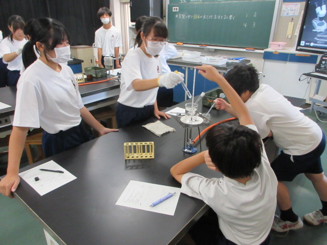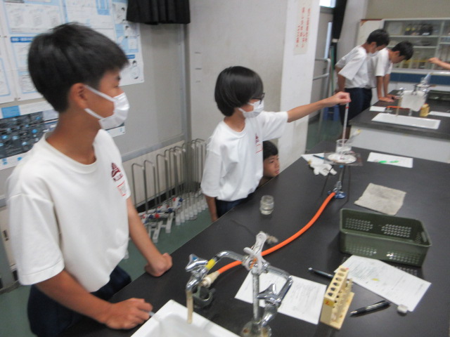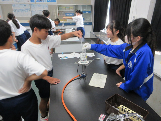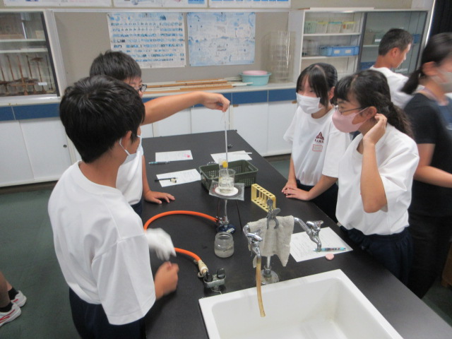 水に溶けた硝酸カリウムと食塩を取り出す実験をしています。