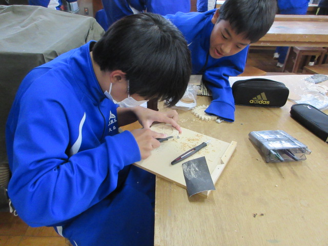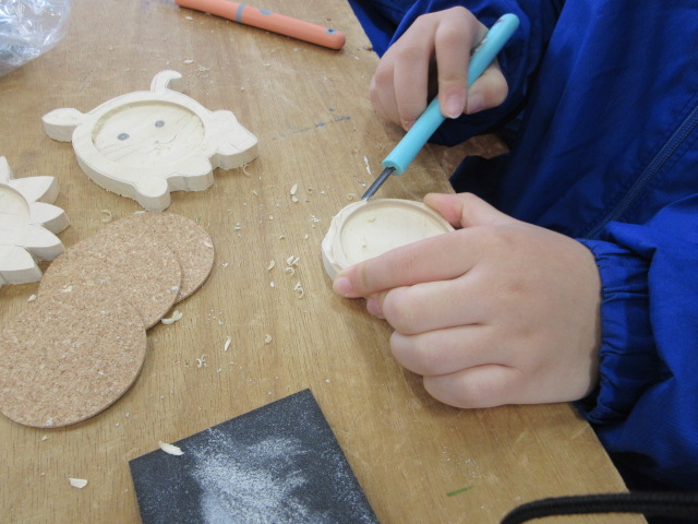 切ったり削ったり(2年) 2025年12月2日 最終更新日時 : 2025年12月2日 kumagaya_edit コースターづくりが進んでいます。電動糸のこで大きく切った後は、彫刻刀で細かい部分を削っていきます。