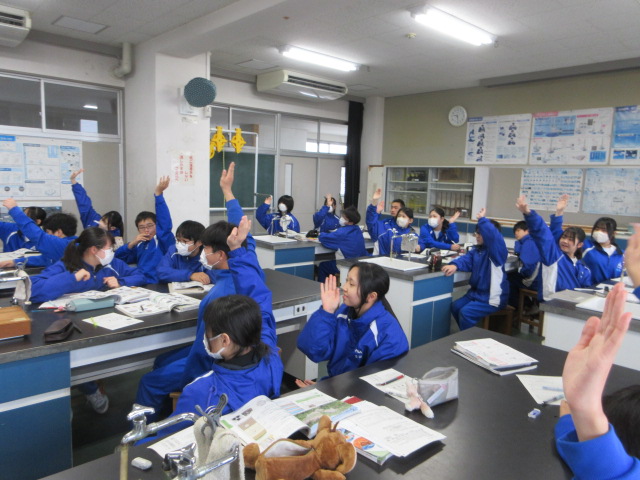 先生オリジナルの化石クイズ。ほとんどの生徒が正解していました。