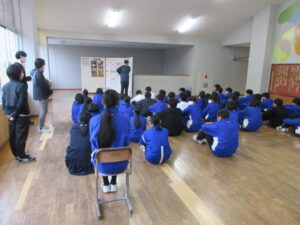 合格報告会(3年) 2025年3月6日 最終更新日時 : 2025年3月11日 kumagaya_edit 合格した生徒が集まっています。本当におめでとうございます。 ①お世話になった人への感謝を! ②目標に向かって努力できたことに自信をもつ! ③合格はゴールではなくスタートです。残りの中学校生活をしっかりと過ごしましょう。