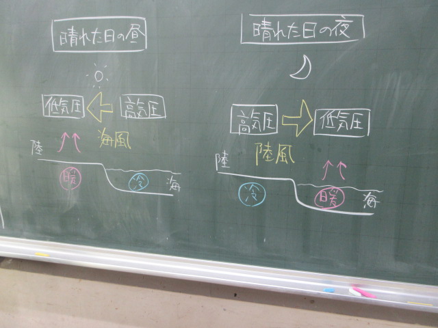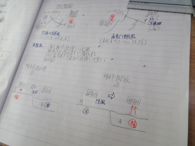 季節風(2年) 2026年1月23日 最終更新日時 : 2026年1月23日 kumagaya_edit メカニズムを学んでいます。熊谷市の冬は北からの季節風が強いです。黒板に描かれた絵がわかりやすい。生徒のノートにも反映されています。
