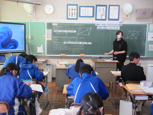 平行四辺形の性質(2年) 2025年12月22日 最終更新日時 : 2025年12月22日 kumagaya_edit はじめは抵抗感もありますが、5つの証明をしているうちに仮定と結論を整理すれば何とかなることに気づきます。