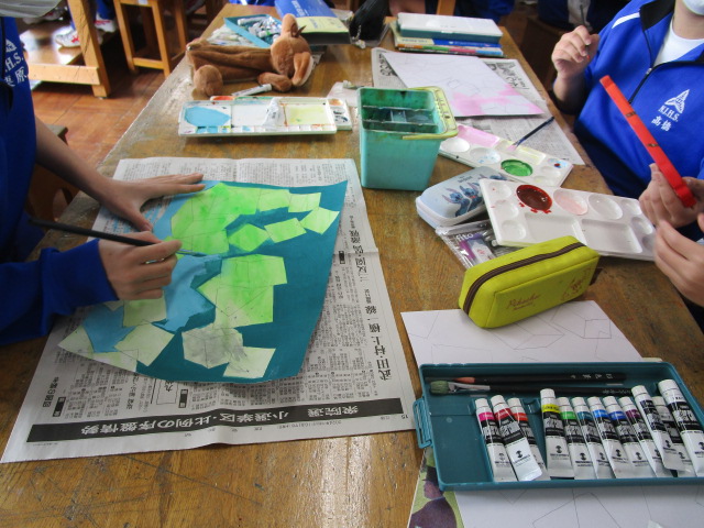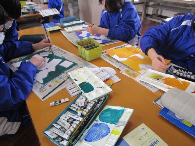 形の配置によるデザイン画(1年美術) 2026年2月17日 最終更新日時 : 2026年2月17日 kumagaya_edit 前回の授業から引き続き、デザイン画の色塗りをしています。図形の重なりに気をつけながら、彩色を施しています。