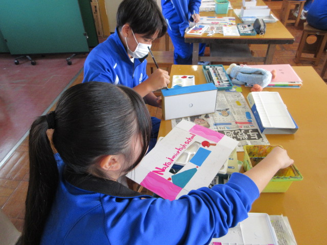 彩色すすむ(3年) 2025年10月23日 最終更新日時 : 2025年10月23日 kumagaya_edit ティッシュボックスを塗っています。身近なものから象徴的なデザインまで多種多様な作品になっています。