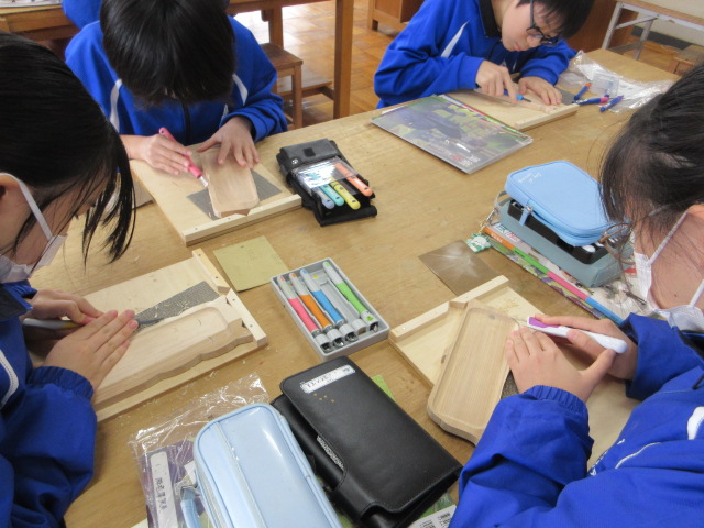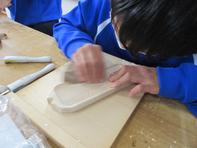 彫る・磨く(1年) 2025年11月18日 最終更新日時 : 2025年11月18日 kumagaya_edit 電動糸ノコによる成形がおおむね終わり、今日は彫刻刀を使っての模様彫りとやすりをつかっての磨き作業を行っています。