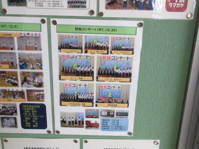 掲示更新 2025年10月31日 最終更新日時 : 2025年10月31日 kumagaya_edit 学校玄関のスライドを昨日の秋桜コンサートバージョンに更新しました。校内の学校行事写真の掲示も追加しました。来週から教育相談も始まりますので、来校の際はぜひご覧ください。