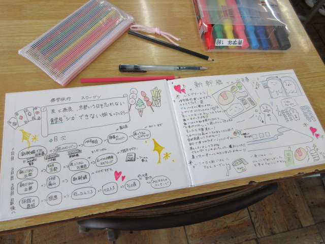 旅行記づくり(3年) 2025年11月6日 最終更新日時 : 2025年11月6日 kumagaya_edit 修学旅行から5カ月。時間がとれずなかなか進まなかった旅行記もいよいよ仕上げの段階です。購入してきた和紙で表紙を飾って完成です。