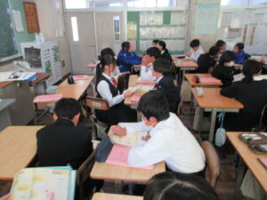 登校している生徒は少ないです。3年生は保育園でふれあい体験を行います。