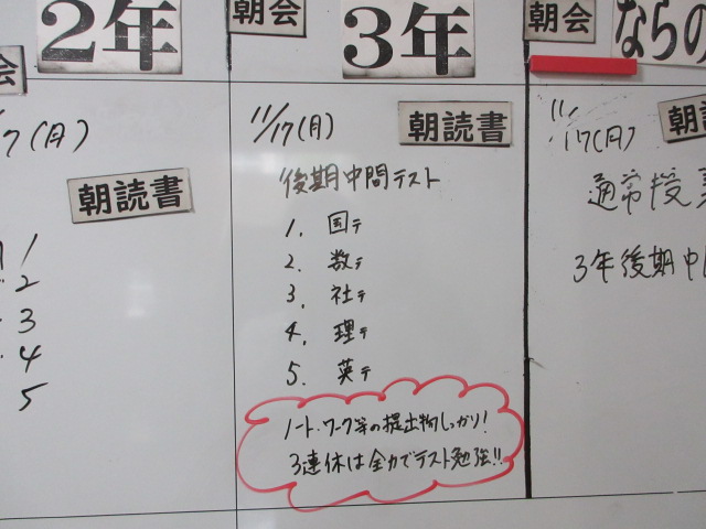 月曜中間(3年) 2025年11月13日 最終更新日時 : 2025年11月13日 kumagaya_edit 明日は県民の日です。週明けの月曜日は中間テストになります。3日間しっかりテスト勉強をしてください。健闘を祈ります。