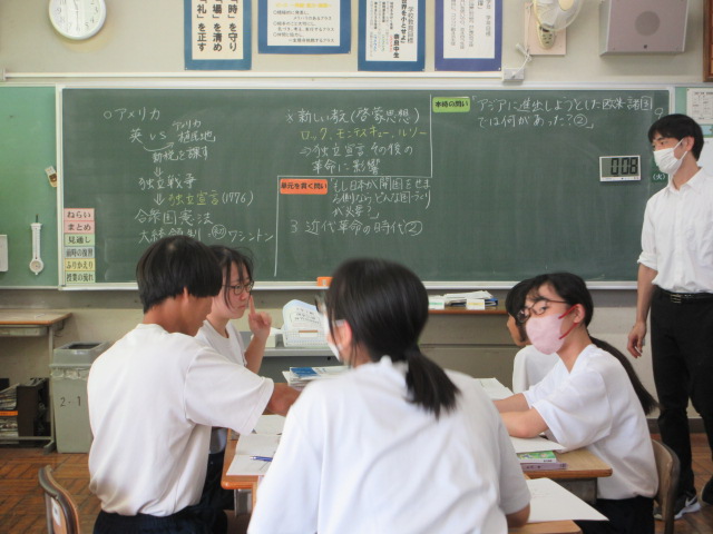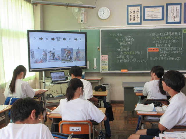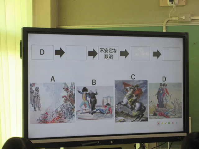 欧米の近代革命(2年 社会) 2025年9月30日 最終更新日時 : 2025年9月30日 kumagaya_edit グループで知恵を出し合って、絵を正しい順に並べ替えています。資料などを使って、一枚一枚の絵について考え、並び順も含めて自分の考えを解説しています。不安定な政治の前後に、歴史的には、どのようなことが起こっていたのでしょう。