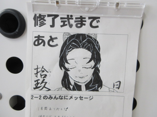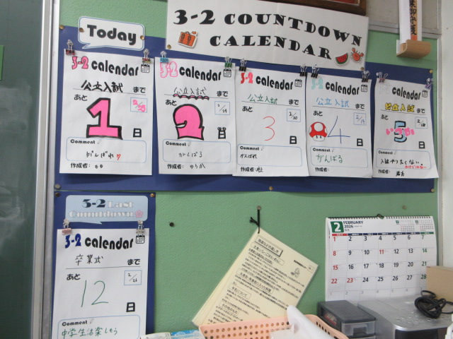 残り○日 2026年2月26日 最終更新日時 : 2026年2月26日 kumagaya_edit 改めて各クラスを見渡すと、卒業まで、修了式まで、公立入試までと様々なカウントダウンの掲示があります。卒業まで12日、修了式まであと19日の登校です。