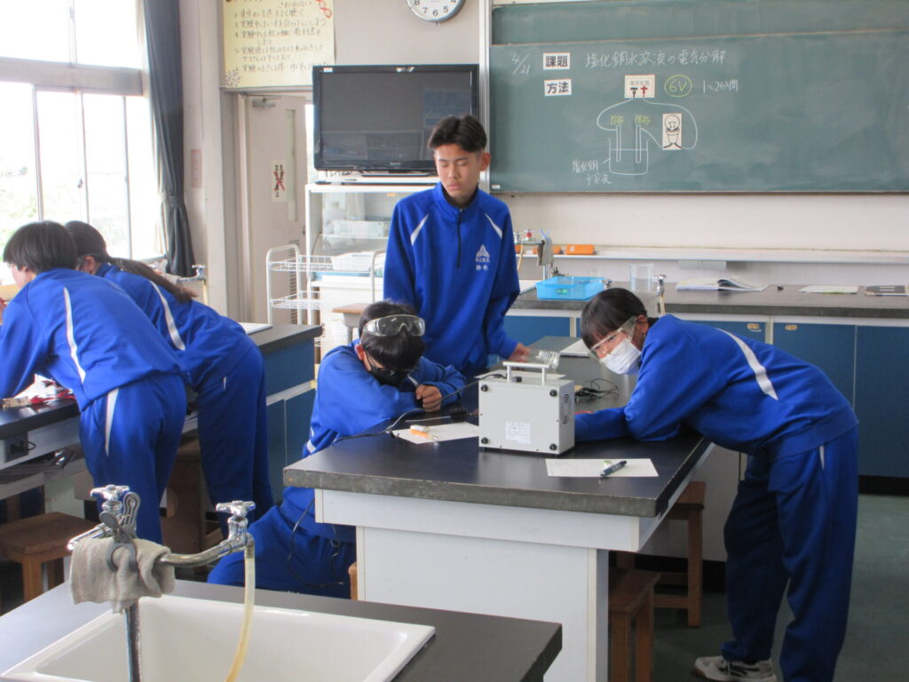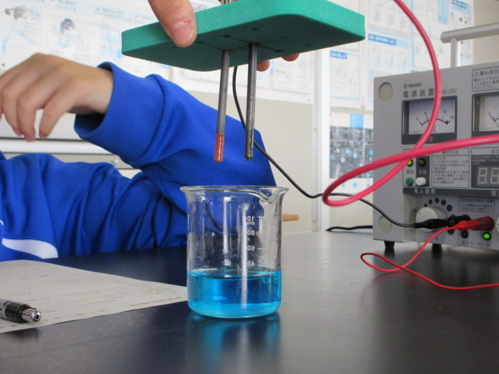 水溶液の電気分解 ~3年 理科~ 2026年4月21日 最終更新日時 : 2026年4月21日 kumagaya_edit 塩化銅水溶液を電気分解する実験を行っています。水溶液に電気を通すことで、何が起こるのか。視覚、嗅覚、聴覚等を使って、反応を観察しています。「ハイターの匂いがする」というワードも飛び出していました。さて、その原因は…