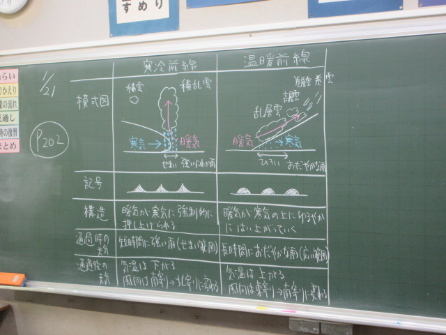 低気圧の学習です。寒冷前線と温暖前線の特徴を整理しています。