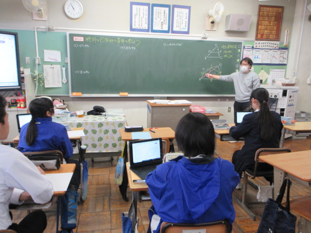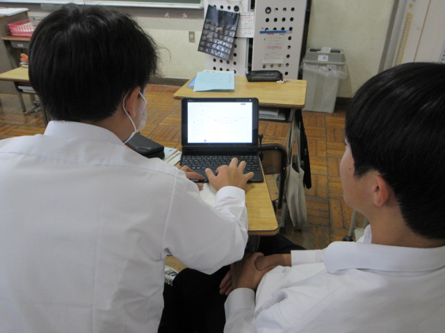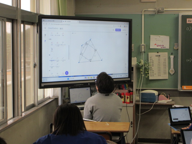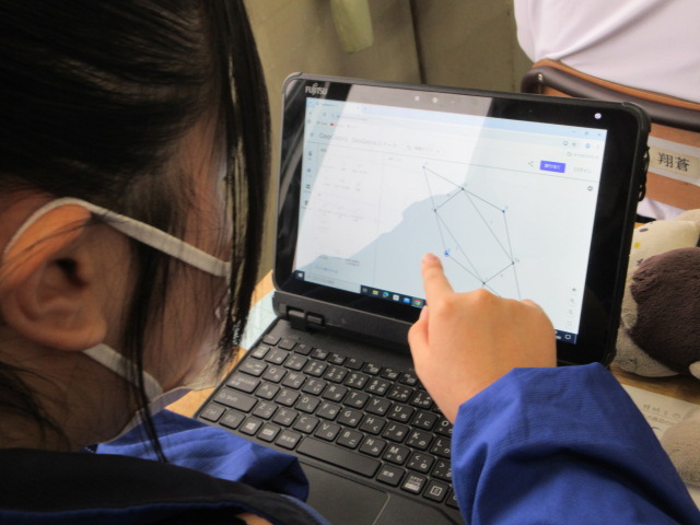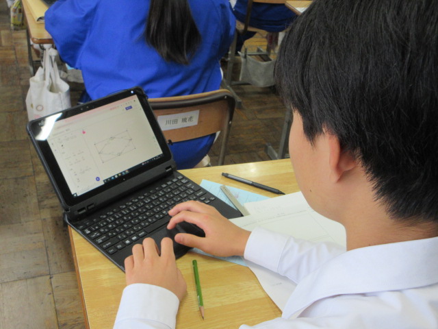 図形アプリを使って、ひし形、長方形、正方形になる条件を考えています。