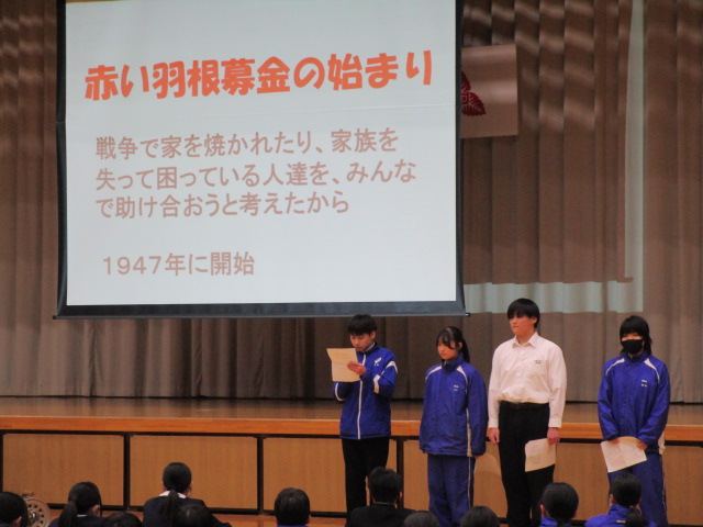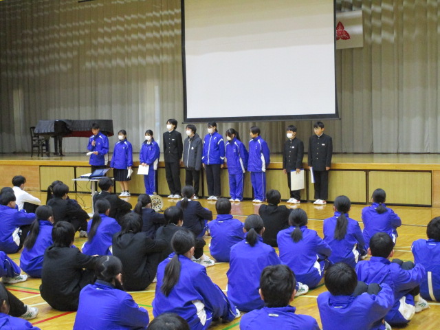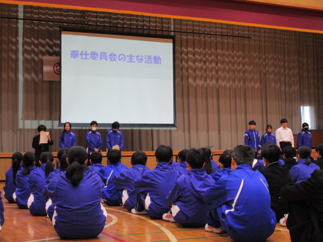 奉仕委員会と環境・美化委員会から、活動報告と全生徒に知ってほしいことの発表がありました。奉仕委員会からは募金活動や新聞紙回収について、そして緑の羽根、赤い羽根募金の違いについての発表。環境・美化委員からは清掃時に注意してほしいこと等についての発表がありました。