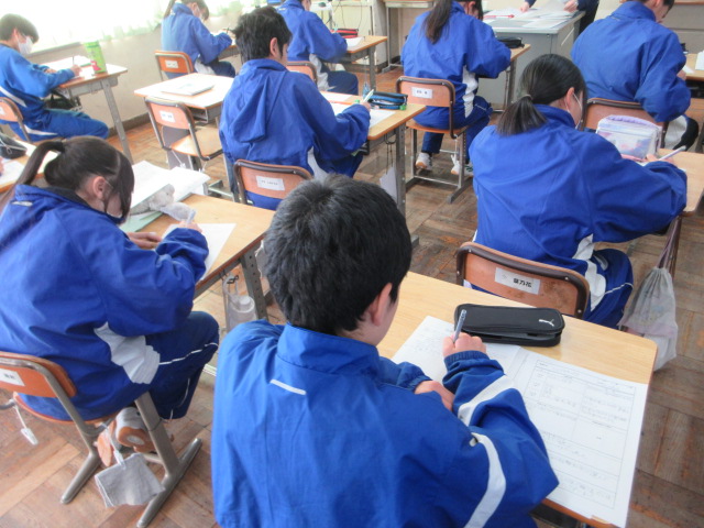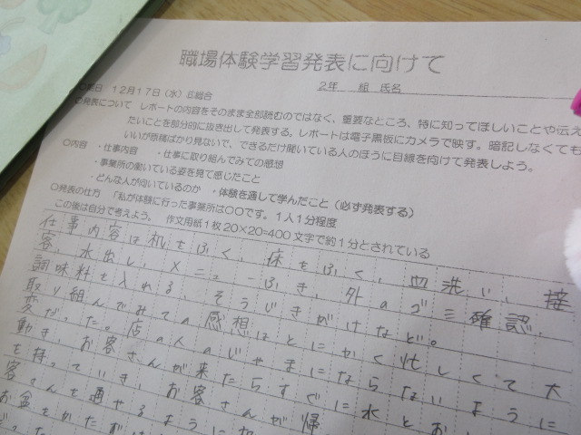 職場体験発表会に向けての準備を進めています。まとめを参考に読み原稿を考えています。