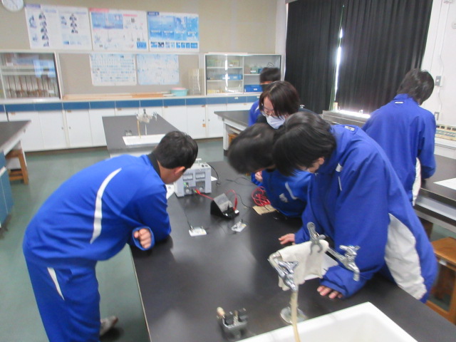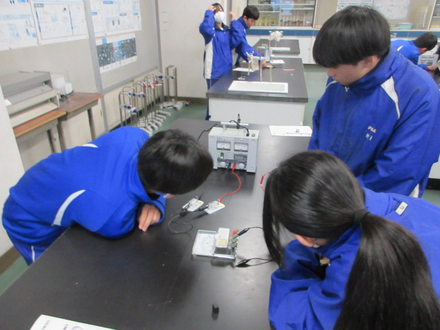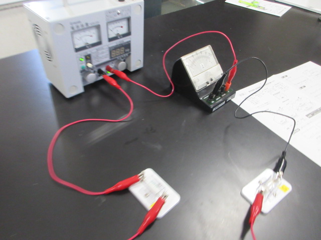 直列回路と並列回路を作り、流れる電流や電圧の変化を調べています。