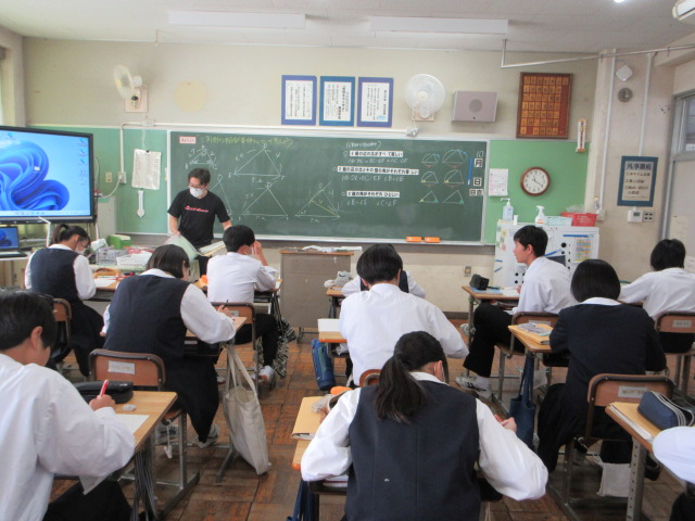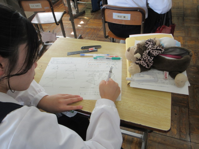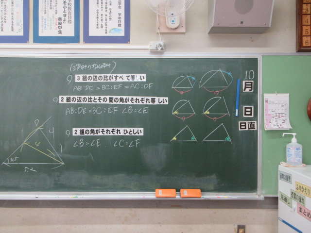 相似条件(3年) 2025年10月29日 最終更新日時 : 2025年10月29日 kumagaya_edit 相似の学習が始まっています。今日は3つの相似条件を見つけています。合同条件と混同しないよう注意です。