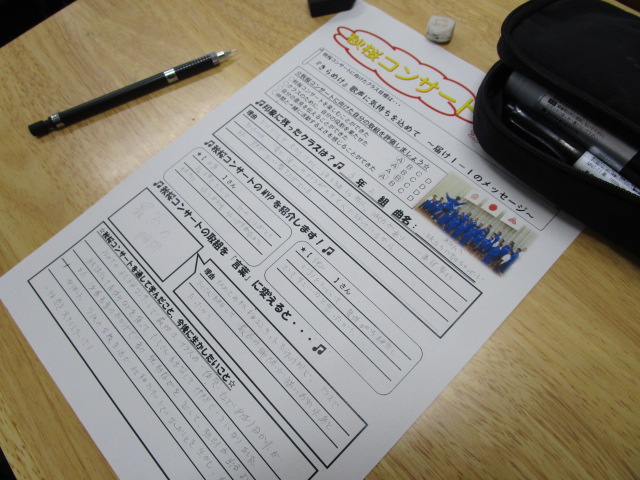 秋桜コンサートのふりかえり(1年) 2025年10月31日 最終更新日時 : 2025年10月31日 kumagaya_edit 昨日の秋桜コンサートを振り返って、まとめをしています。心に残ったクラスの合唱、クラスの中で活躍していた人、合唱の取り組みを通して学んだことなどをまとめます。わからない漢字は辞書を使って調べていました。