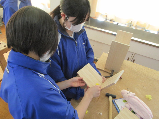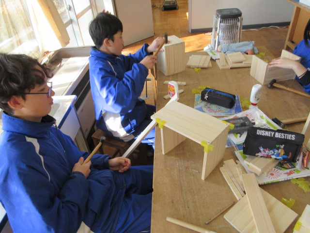 組み立て(2年) 2026年1月30日 最終更新日時 : 2026年1月30日 kumagaya_edit 切った木材を、ボンドとくぎを使って組み立てていきます。徐々に本棚の完成形が近づいていきました。