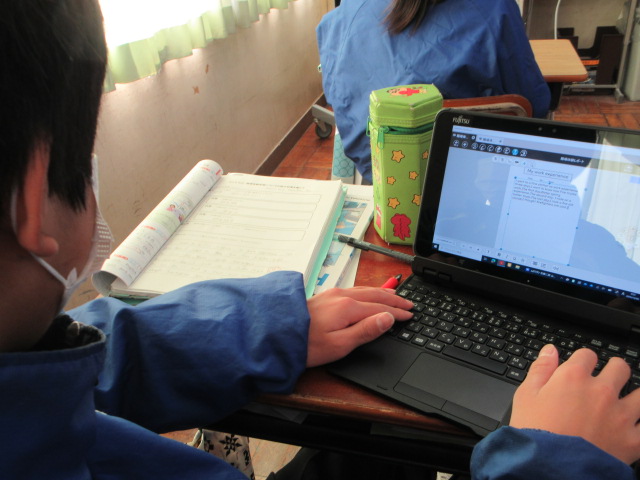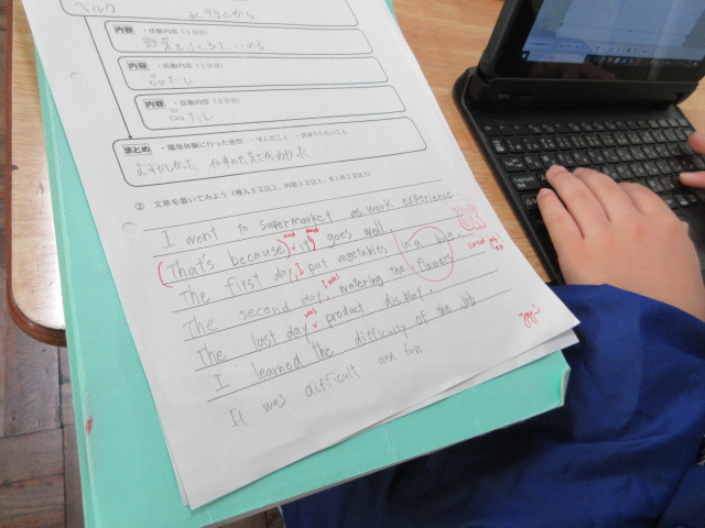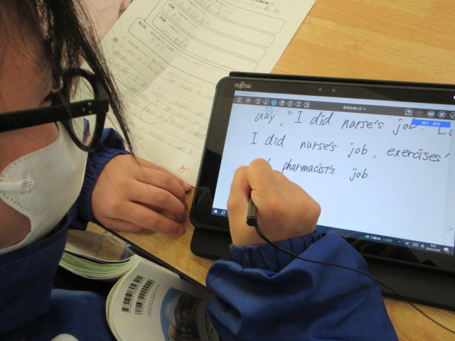英語レポート(2年) 2025年12月5日 最終更新日時 : 2025年12月5日 kumagaya_edit 英語の授業では職場体験についてのレポートを英語でまとめています。事前に整理した用紙と、タブレットの辞書機能を駆使して仕上げていきます。
