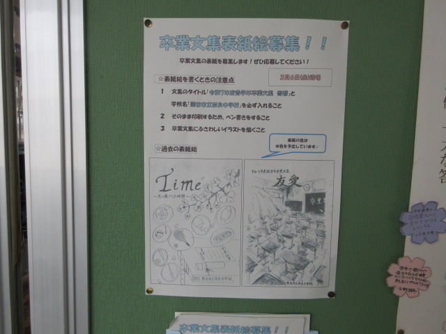 表紙絵募集(3年) 2026年2月24日 最終更新日時 : 2026年2月24日 kumagaya_edit 卒業に向けて3年生が卒業文集を作成します。廊下には表紙絵募集の貼り紙が。受検後でも間に合いますので応募してください。