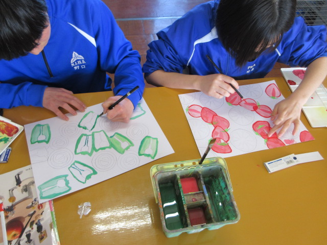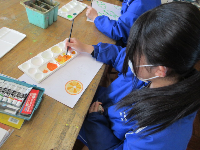 野菜・果物(2年) 2026年2月19日 最終更新日時 : 2026年2月19日 kumagaya_edit デザイン化した野菜や果物に色を付けています。リアルさを追求する生徒とファンタジーを追求する生徒がいるのはおもしろいです。