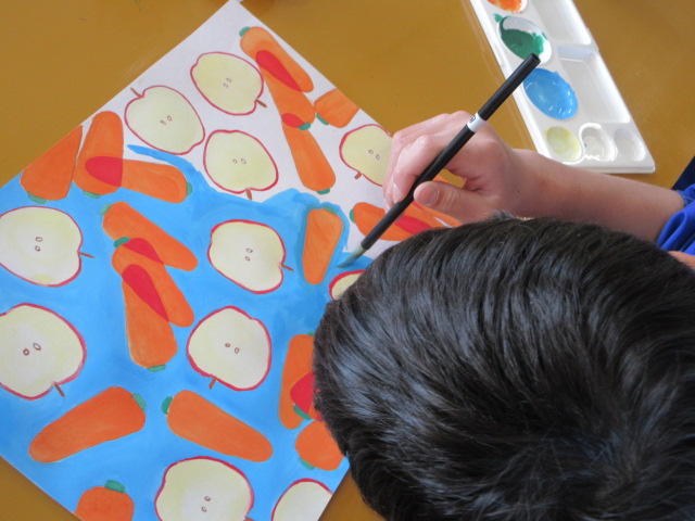 デザインした野菜が塗り終わり、その間を塗るには細筆が役立ちます。