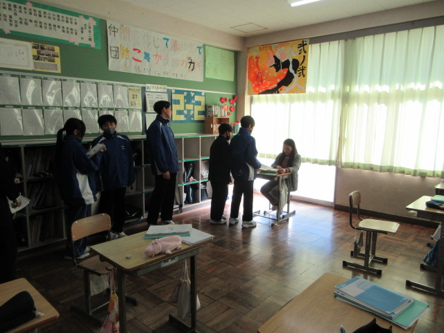 二手に分かれて音読テストをしています。正しく読めているでしょうか。