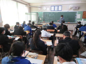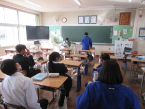 保健の授業では、自転車による交通事故の防止についての授業を行っています。意見が活発にでています。「ながら運転」はダメ⇒「かもしれない運転」を心がける。