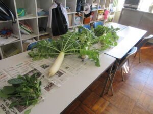 朝採れ大根です。太くまっすぐ育っています。収穫し甲斐のあるよいできとなっています。