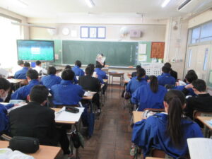 買い物をするときの様々な表現について確認しています。難しいかと思いましたが、生徒は簡単に解答していました。学んだことが身についています。