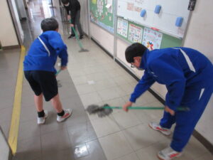 掃除の時間、校内のいたるところで床を磨く姿が見られます。目指す生徒像は「知性をみがく生徒」ですが、床もしっかり磨きます。