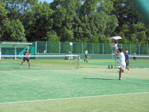 テニス部は明日大会です。高2の先輩と顧問の先生が混ざり試合形式の練習をしています。本番を想定したよい練習になっています。