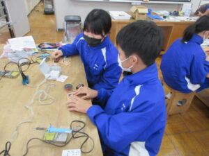 ハンダ付けで電子回路を作っています。今回はスイッチを入れるとスピーカーから音がでます。指を近づけると音が変わります。