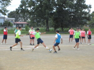 サッカーの授業ですが、今はパスコースを見つけるために、手を使ってよいルールになっています。